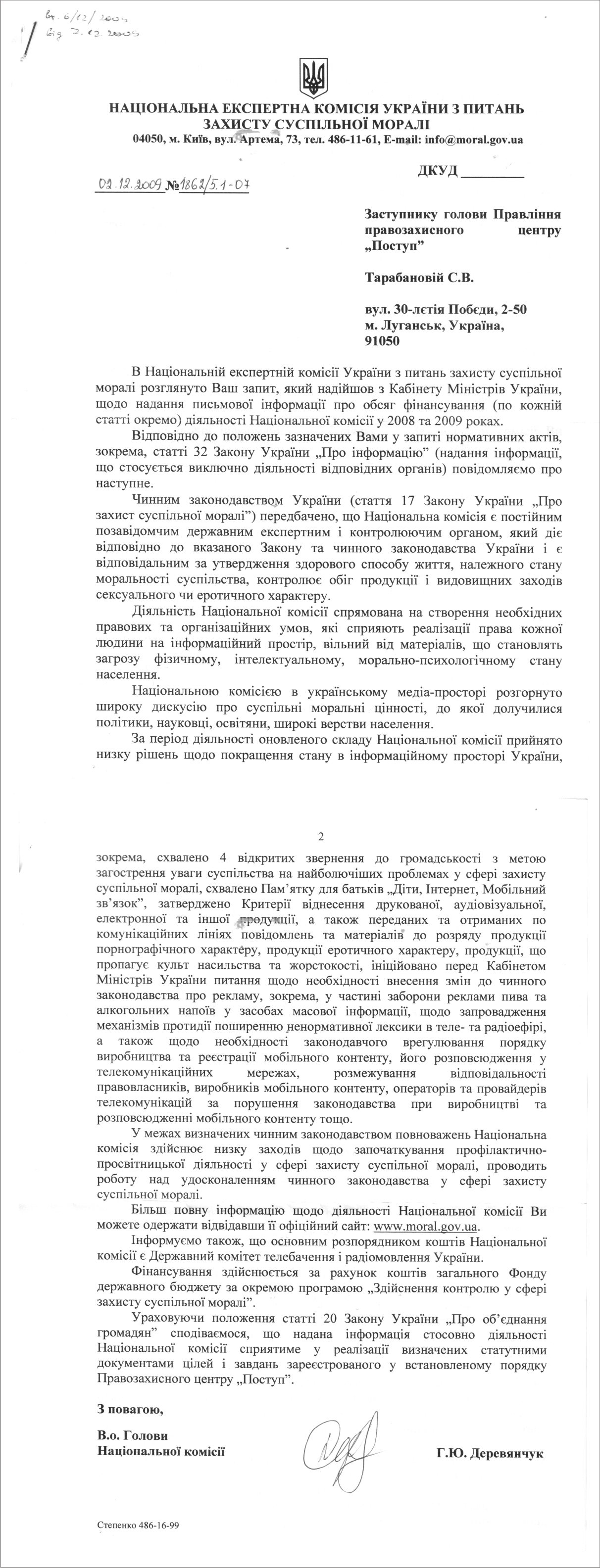 Ошеломляюще прекрасен и заключительный аккорд этой симфонии. После двух страниц полнейшей лабуды, не имеющей ничего общего с сутью запроса, господин Г.Ю. Деревянчук (именно его фамилия стоит под этим уникальным документом) вежливо выражает надежду на то, что «предоставленная информация, касающаяся деятельности Национальной комиссии будет содействовать реализации определенных уставными документами целей <…> правозащитного центра “Поступ». Согласитесь, это обезоруживает.
