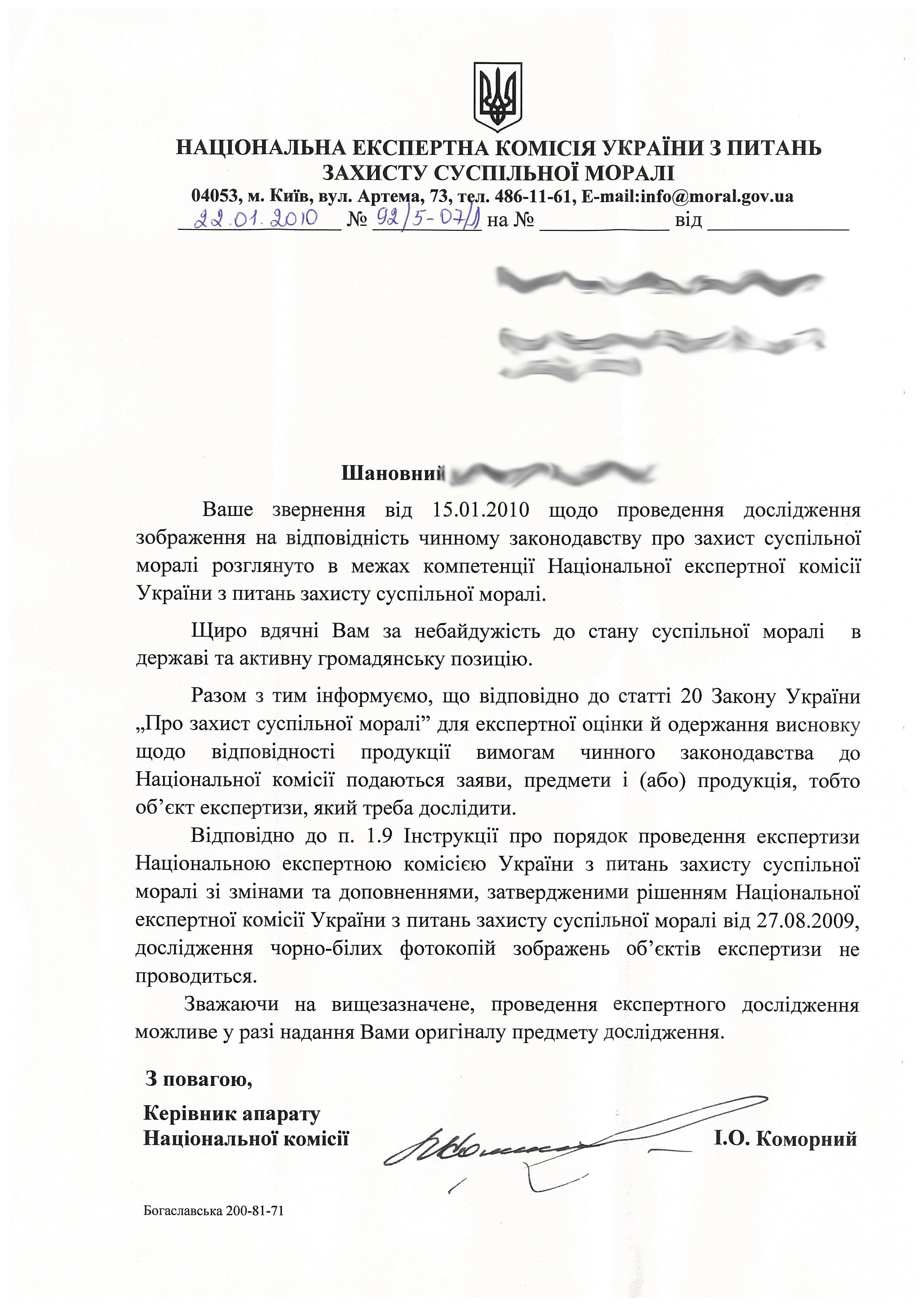 ЖЖ-юзер bajaz повідомляє про доволі цікаву відповідь нацкоммору на звернення з вимогою провести експертизу зображення[i] на предмет його відповідності чинному законодавству та можливість обігу на території України. Керівник апарату НЕК пан Коморний щиро дякує bajaz за активну громадянську позицію, небайдужість до проблеми суспільної моралі в нашій країні та рішуче відмовляє у проведенні експертизи, посилаючись на те, що НЕК не проводить дослідження «чорно-білих фотокопій зображень об’єктів експертизи» (копію відповіді див. нижче). Можна вважати цю відповідь ще одним аргументом на користь твердження що НЕК є виключно інструментом цензури та вибіркового тиску. Надто очевидно, що комісія застосовує подвійні стандарти (що закладені ще на рівні кучмівського закону «Про захист суспільної моралі») і «експертує» лише за наявності політичного, або комерційного замовлення.