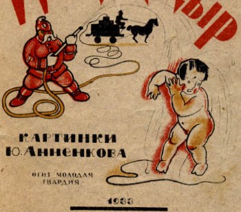 Обложка первого издания «Мойдодыра», 1933 г. Художник Анненков Ю. П. Трактовка согласно критериям Национальной экспертной комиссии: Партнер №1 в эротичном костюме пожарного с фаллоимитатором в руках, демонстрирующим явные признаки экскреторных функций. Партнер №2 - обнажённая модель несовершеннолетнего с демонстрацией лонного участка и ягодиц.