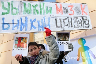 Позицію висловлювали скандуванням і написами на плакатах: «Увімкни мозок – вимкни цензуру!», «Ні цензурі! Ні дискримінації», «Гомофобія і цензура = 8711», «Тест на демократію – це свобода слова!».