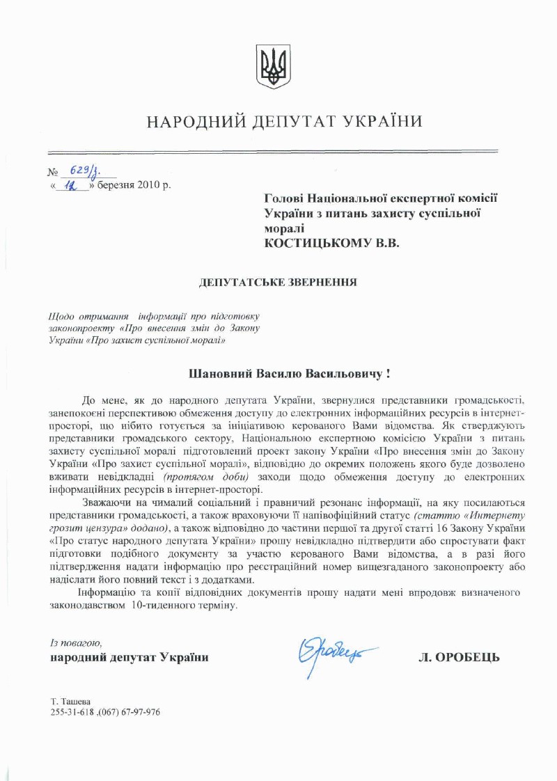 ВТ, 03/16/2010 - 01:57Народний депутат Леся Оробець направила голові Національної експертної комісії з питань захисту суспільної моралі звернення, в якому вимагає надати інформацію щодо суспільнонебезпечного законопроекту.