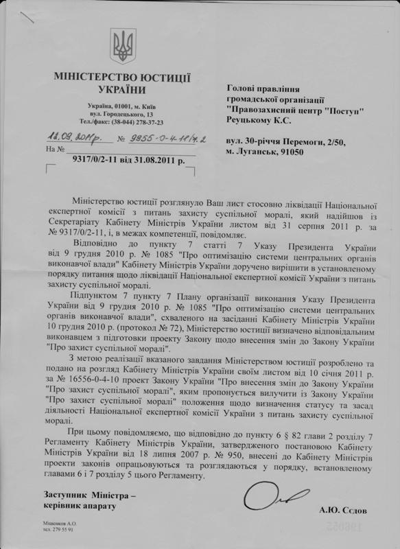 Міністерство юстиції надало відповідь на звернення громадських організацій з вимогою зробити все необхідне в рамках повноважень з метою прискорення внесення до парламенту проекту закону, що передбачав би ліквідацію Національної Експертної Комісії з питань захисту суспільної моралі відповідно до Указу Президента № 1085/2010 від 12 грудня 2010 року «Про оптимізацію системи центральних органів виконавчої влади». Зокрема у відповіді говориться, що згідно із зазначеним Указом Мін’юст визначено відповідальним виконавцем з підготовки відповідного законопроекту. Такий законопроект був розроблений та поданий на розгляд Кабінету Міністрів ще 10 січня 2011 року. У ньому запропоновано вилучити із Закону «Про захист суспільної моралі» положення щодо статусу та засад діяльності НЕК. Вже майже рік документ знаходиться на розгляді та не вноситься для обговорення на засіданні Кабінету Міністрів, не зважаючи на те, що відповідно до Регламенту КМУ законопроект, прийнятий до розгляду, має бути проаналізований та запропонований для обговорення не більше ніж протягом місяця з моменту подання. Дотепер жодних вагомих підстав для відкладення розгляду проекту на засіданні КМУ не було надано. Кабмін протягом року відхиляється від виконання своїх обов’язків, своєю бездіяльністю ігнорує Указ гаранта Конституції, тим самим демонструючи зневагу до Президента, та ставить під сумнів вагомість рішень «народного обранця».