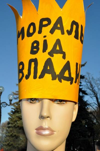 Під Верховною Радою, де відбувалися слухання з питань моралі, роздягли жінку-манекена. Корону моральності їй натягнули аж на очі, мовляв, влада сліпа.